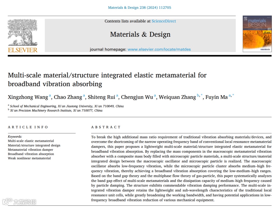 相关研究成果以“多尺度材料/结构一体化宽带弹性超结构吸振设计”(Multi-scale material/structure integrated elastic metamaterial for broadband vibration absorbing)为题,在线发表在《Materials & Design》[Mater. Des. 238, 112705, 2024]上。西安交通大学为第一作者单位,西安交通大学和中国船舶集团第七O五研究所为通讯单位,机械工程学院博士生汪兴中为第一作者,马富银教授和张炜权高级工程师为共同通讯作者,机械工程学院吴成军教授、博士生张超和硕士生芮世腾对论文提供了重要贡献。