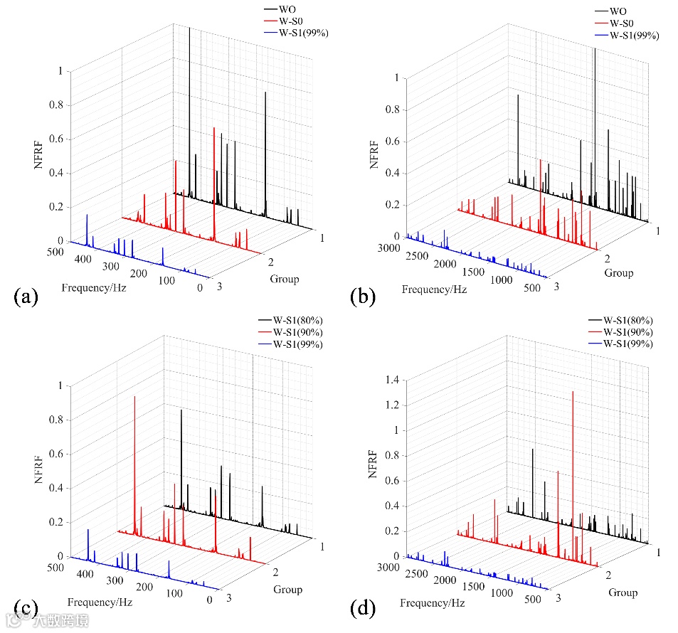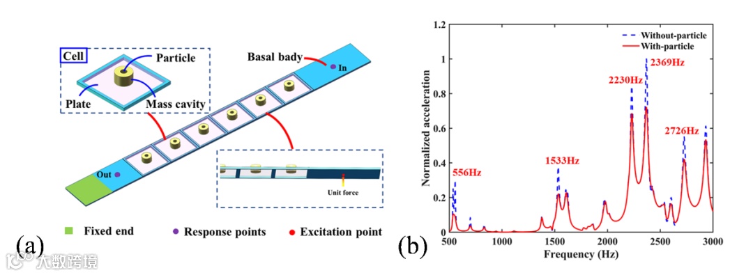 论文进一步地对多尺度超结构中微观颗粒的中高频损耗能力进行了理论研究。本文采用气-固两相流法探究了粒子的中高频阻尼效应。气-固两相流法是在气体动力学理论的基础上建立了等效粘性阻尼模型,在考虑颗粒间摩擦、碰撞和运动效应的同时,可以降低计算成本。研究结果表明,如图4所示,在500∼3000Hz范围内,每个峰值都有一定程度的衰减,充分展示了颗粒阻尼的能量耗散特性。换句话说,在超结构中嵌入微观粒子可以发挥颗粒的中高频吸收作用。与前文的带隙理论相结合,这充分说明了基于微观粒子和宏观谐振器设计的多尺度材料/结构一体化超结构,能够有效整合超结构的带隙效应和颗粒阻尼的中高频损耗效应,从而实现覆盖低-中-高频段的全范围减振效果。