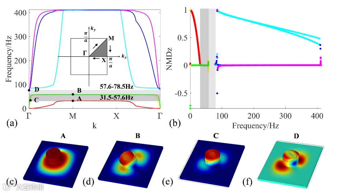 作者对多尺度超结构的各结构参数和材料参数影响进行了具体的分析,根据参数影响结果,可针对指定吸振频率进行定制化结构设计,带隙特征如图3所示。利用色散曲线、模态位移曲线和模态图,可以判断超结构带隙由弯曲波带隙和完全带隙组成,且带宽达到了现有研究的1.8倍。说明了该结构不仅能够吸收低频振动,且同时存在更加宽泛的带隙频率范围。