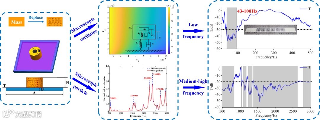 减振是装备研制和服役过程中的重要课题,尤其是抑制具有大能量、难耗散特征的低频振动。现有的减振技术主要包含吸振、隔振和阻振等。在吸振技术中,传统的动力吸振器存在较大附加质量比、大尺寸和工作频段窄等问题。近二十多年来,超结构由于其亚波长特性,为低频振动能量控制提供了新的思路。对于吸振超结构而言,带隙宽度是一项很重要的性能指标,研究学者们为如何扩大带隙宽度进行了广泛的研究。但是,在100Hz以下的低频范围内,工作带宽往往只能达到十几Hz,且现有的超结构减振器大多只能吸收单个窄带振动。在阻振技术中,颗粒阻尼技术由于其优异的宽带减振效果和环境适应性,在工程实践中得到了广泛的应用。但该方法主要适用于中高频段的阻尼减振,而低频段的阻尼效果较差。对此,如何在保证轻量化的基础上,实现覆盖低频、中频、高频的全频段吸振是一大学术挑战。