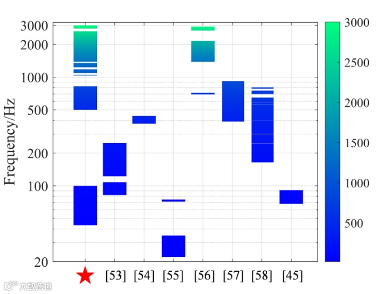 为了更好地与现有研究进行比较,论文列出了一些现有研究的带隙范围,如图7所示。可以看出,该多尺度超结构单元不仅在低频段具有足够低的带隙和更宽带宽,而且在中高频段也表现出良好的效果。该结构的作用区间跨度大,具有较好的大范围宽带减振效果,对超结构设计研究具有重要意义。