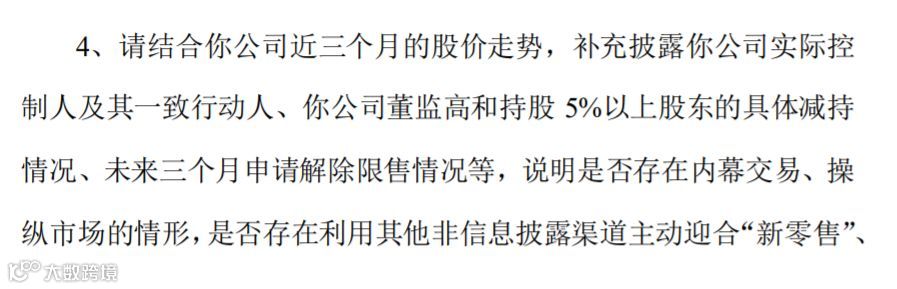 具体表述为:“结合公司近三个月的股价走势,补充披露你公司实际控制人及其一致行动人、你公司董监高和持股5%以上股东的具体减持情况、未来三个月申请解除限售情况等,说明是否存在内幕交易、操纵市场的情形,是否存在利用其他非信息披露渠道主动迎合‘新零售’、‘网络直播’等市场热点进行公司股价炒作并配合股东减持的情形。”