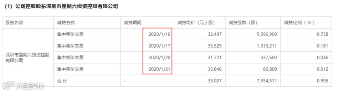 东财Choice数据显示,1月16日、1月17日、1月20日、1月21日,星期六控股分别减持559.69万股、133.32万股、33.76万股、8.68万股,合计735.45万股,减持均价为33.03元/股,变现2.43亿元。