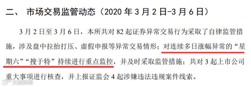 值得一提的是,深交所3月6日披露的“深市监管动态”一文提到,3月2日至3月6日,深交所对连续多日涨幅异常的星期六、搜于特等股持续进行重点监控,并及时采取监管措施。
