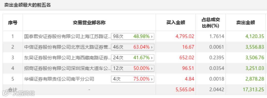 其中,国泰君安上海江苏路证券营业部买入4795万元,卖出4120万元。自2019年12月13日以来,该席位累计现身龙虎榜18次,买入金额合计3.64亿元,卖出金额合计4.66亿元。