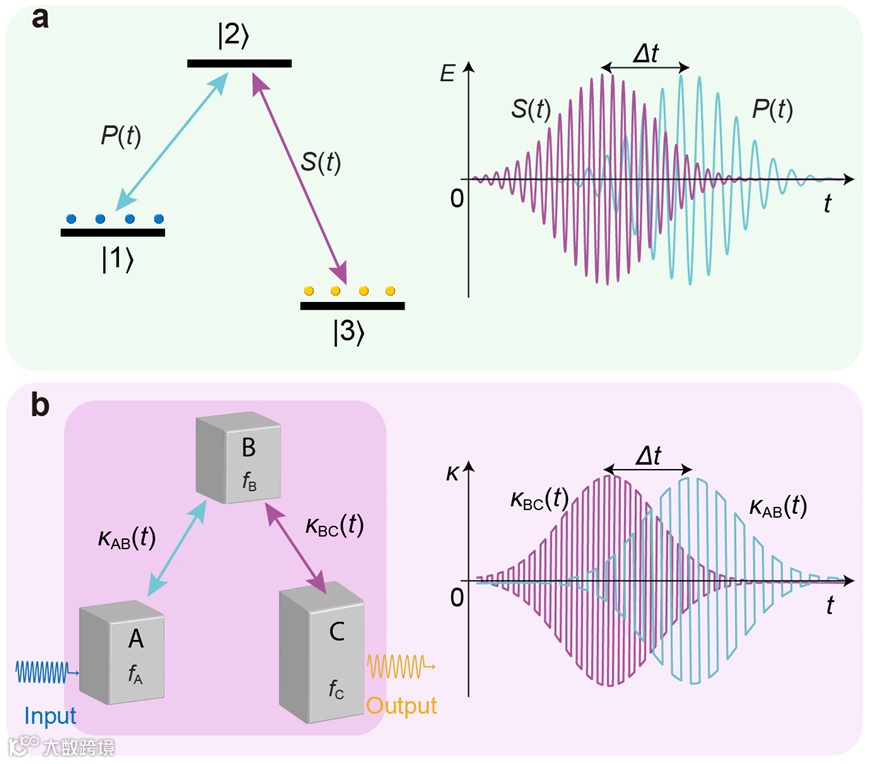 图1 鲁棒且非互易的瞬态绝热演化通道。(a)三能级原子系统中的STIRAP:具有Δt时间差的光脉冲借助中间态|2>在|1>到|3>态之间实现鲁棒的转移通道。(b)具有高斯型包络且符号周期性翻转的时变耦合κAB(t)和κBC(t),在频率失谐腔A和C之间实现鲁棒的声能量转移,同时实现完全的频率转换。