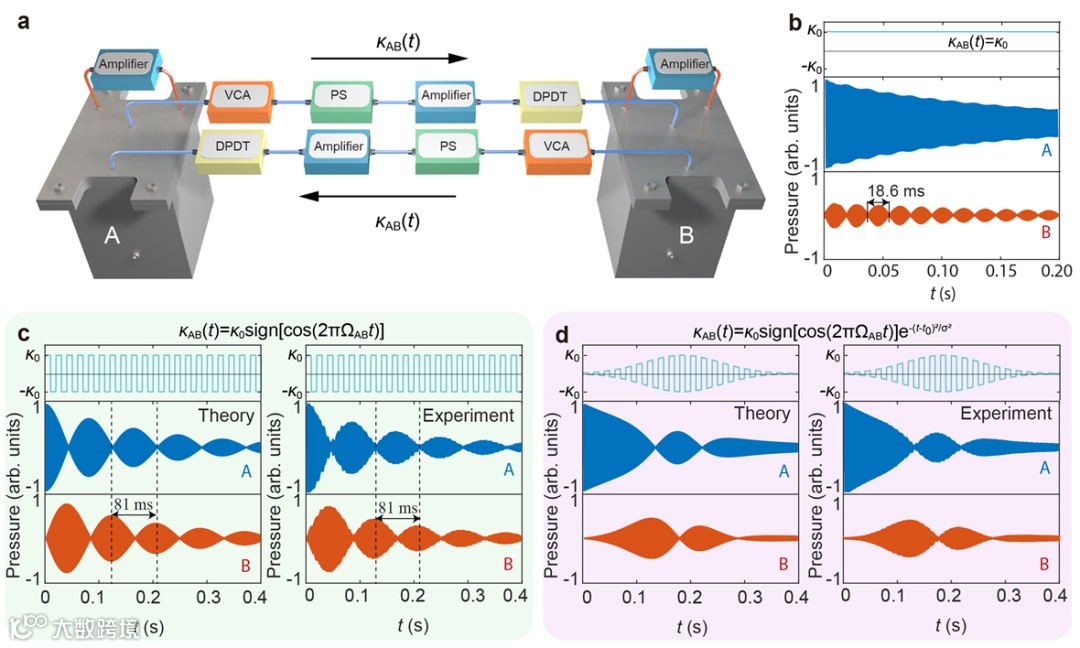 图2 TQPM实现频率失谐腔之间的声能量转移。(a)实现失谐腔A、B之间动态耦合κAB(t>0)的电路连接示意图,包含压控增益VCA、移相器PS、放大器和双刀双掷继电器DPDT等器件。(b) κAB(t>0) = κ0时实验观测A到B腔有限的声能量转移。(c-d)采用TQPM技术,即周期性翻转耦合符号,实现A、B两腔之间完全的声能量转移。