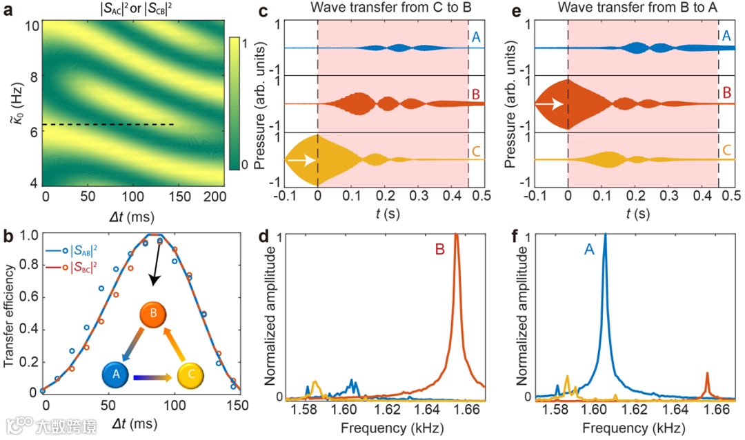图4 具有频率转换功能的瞬态声波环路器。(a) 理论仿真|SAC|2和|SCB|2随耦合幅值κ0以及时间差Δt的关系。(b)实验测量κ0=6.1Hz时|SBC|2和|SAB|2随Δt的变化。(c-f)实验测量κ0=6.1Hz且Δt=90ms下C腔到B腔(c-d)或B腔到A腔(e-f)的声能量转移和频率转换。