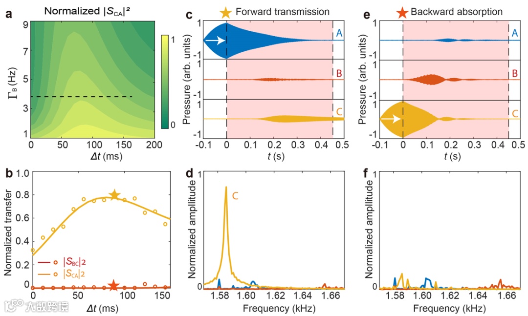 图5 单向声波吸收器。(a)理论仿真归一化的|SCA|2随B腔损耗ΓB以及耦合时间差Δt的变化。(b)实验测量ΓB=4Hz时|SCA|2和|SBC|2随Δt的变化,与仿真结果相吻合。(c-f)实验结果证明Δt=90ms时系统表现为单向吸收器。
