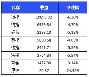 美三大股指周三集体下跌。美股盘中再度触发熔断机制,为本月来第四次,史上第五次。道指跌逾1300点失守2万点,盘中抹去特朗普上任以来全部涨幅。截至收盘,纳斯达克指数下跌344.94点,跌幅4.70%,报6989.84点;道琼斯指数下跌1338.46点,跌幅6.30%,报19898.92点,标普500指数下跌131.09点,跌幅5.18%,报2398.10点。恐慌指数VIX上涨5.1%,报79.81。板块全线走低,航空股重挫,特斯拉跌16%;蔚来及趣店因财报疲软分别跌16.90%及20.59%。