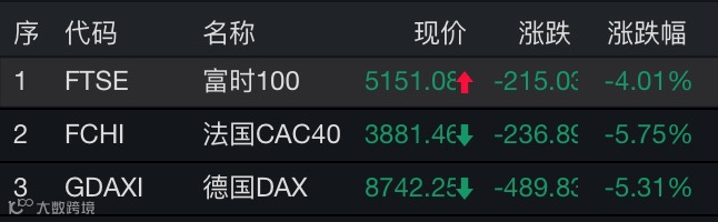 欧洲主要股指16日全线走软。据Wind数据,截至收盘,德国DAX指数跌5.31%,报8742.25点;法国CAC40指数跌5.75%,报3881.46点;英国富时100指数跌4.01%,报5151.08点。