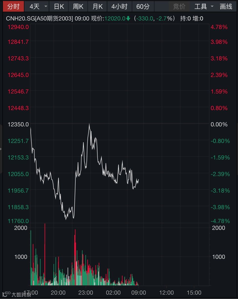 另外,富时中国A50指数期货主力合约夜盘收跌2.67%。值得注意的是,该合约盘中一度拉升,接近上涨。