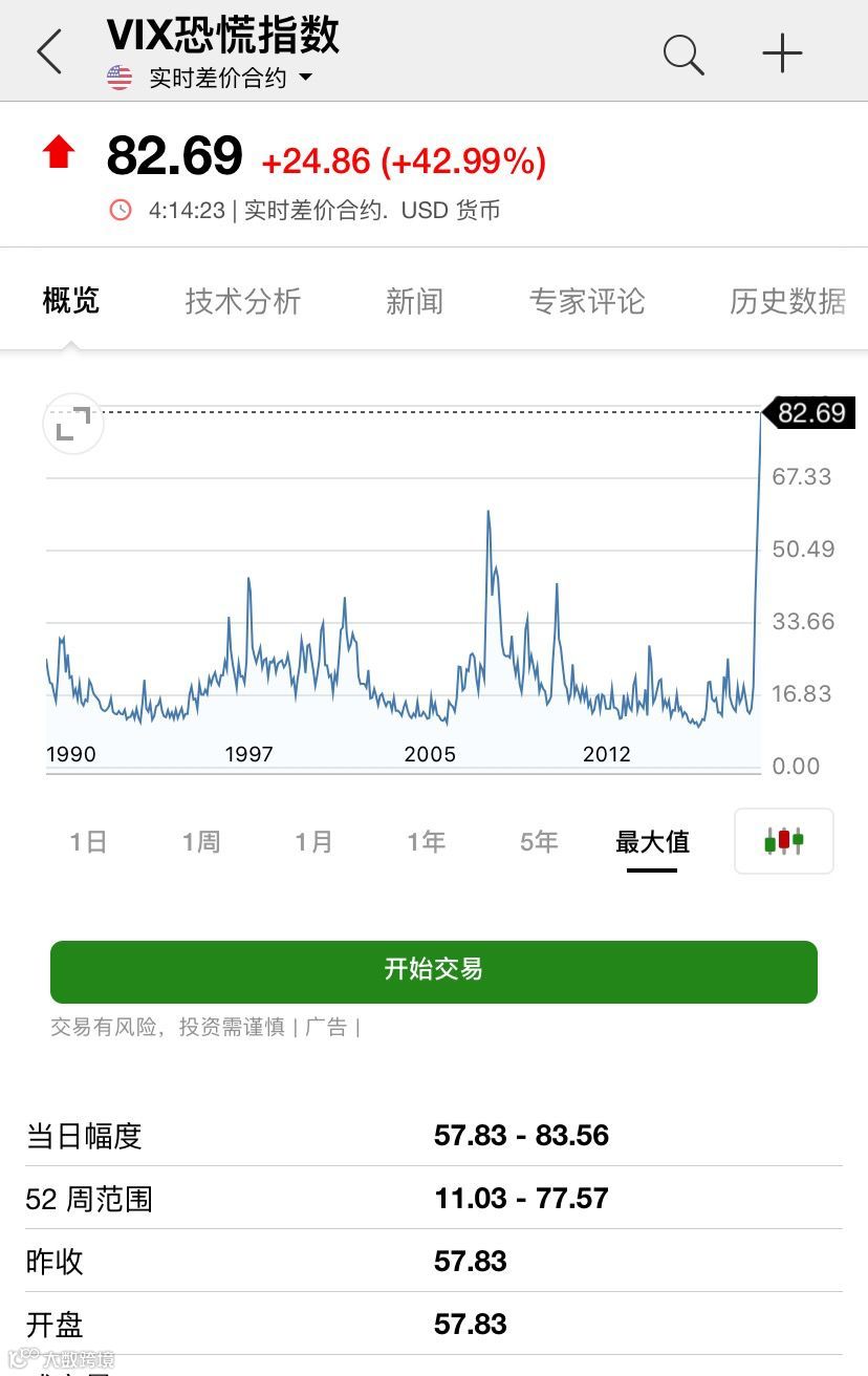 据英为财情数据,衡量美股波动率的恐慌指数(VIX)16日收盘飙涨至80上方,创历史收盘新高,涨幅达42.99%。