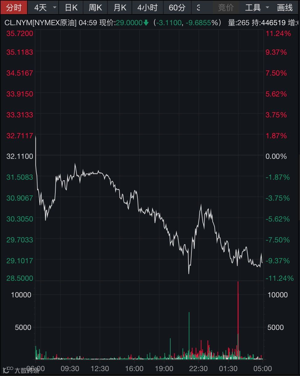 大宗商品市场上,原油和黄金16日携手下挫。据Wind数据,NYMEX原油期货16日跌至30美元下方,收报29美元/桶,日内跌幅近10%;COMEX黄金期货收跌0.15%,报1514.5美元/盎司,创去年12月以来收盘新低,连续第五个交易日下跌。