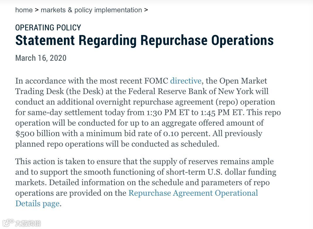 在16日美股开盘大跌之际,美联储紧急追加总规模为5000亿美元的额外回购操作。