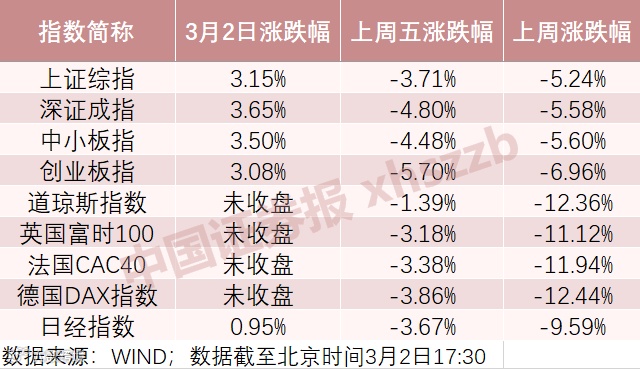 上周受海外市场重挫拖累的A股市场,今天(3月2日)迎来反攻。上证综指上涨90.63点,重新迫近3000点整数关口,深证成指、创业板指也同步大涨超3%。