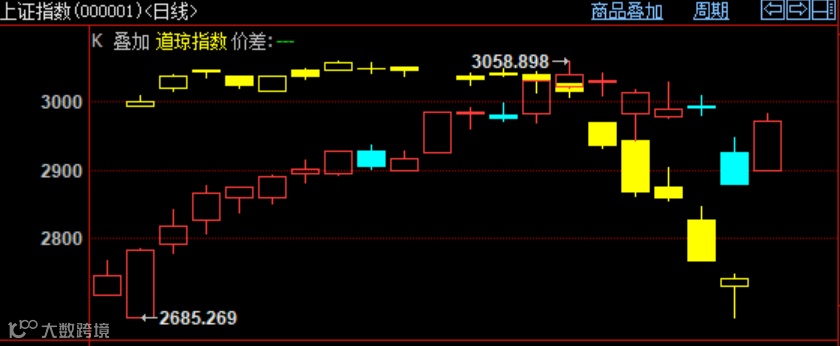 2月以来上证综指与美股道琼斯指数日K线叠加对比