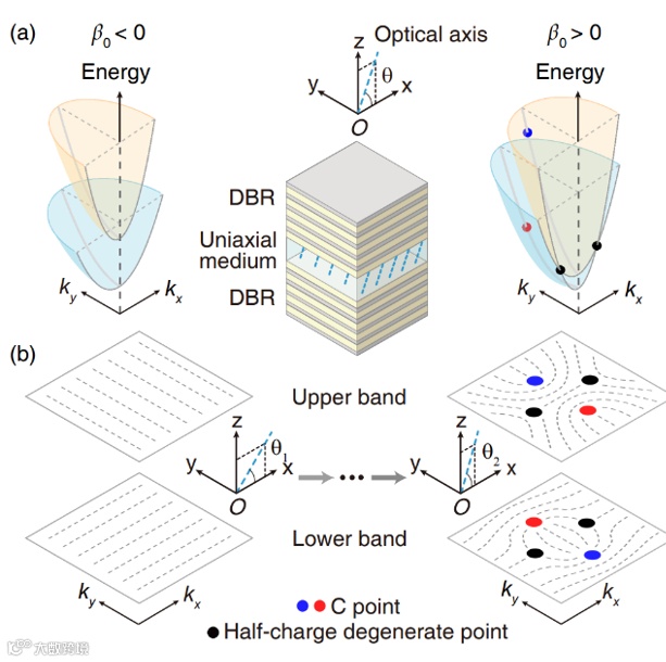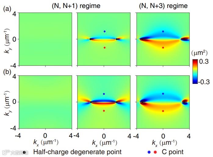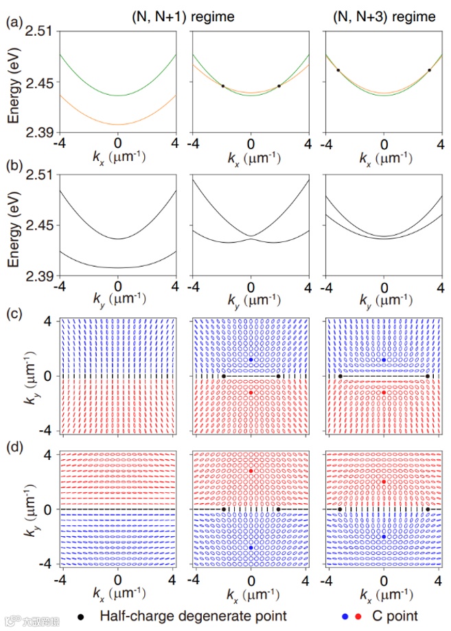代表模式间的RD耦合。当两组模式彼此分开时,能带上没有任何偏振奇点及涡旋。通过调节微腔中各向异性介质光轴的方向,能带会在高对称方向相交,形成一对携带半整数拓扑荷的简并点。另外,由于拓扑荷在演化过程中守恒,因此在其他位置必然存在另外的涡旋。由于RD耦合,研究团队发现在每条能带上还存在一对圆偏振点。这一对圆偏振点具有相反的手性和相同的拓扑荷,使得每条能带的拓扑荷的总和保持不变(图1)。