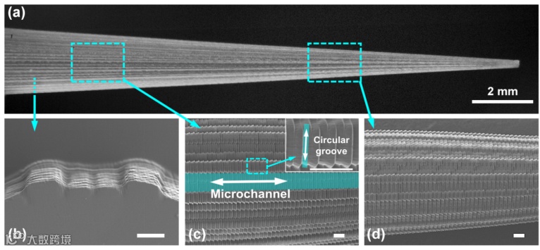 图1 纵横织构锥体模型与结构表征。(a)模型全景图;(b)剖视图;(c-d)局部放大图;(b-d)比例尺:100 μm。