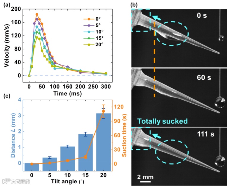 图4 纵横织构锥体的倾角对液滴自运输的影响。(a)液滴自运输速度与时间的关系;(b)锥体表面滞留液滴的吮吸运输行为;(c)锥体中部和末端两液滴之间的距离L和吮吸时间与倾斜角度的关系。