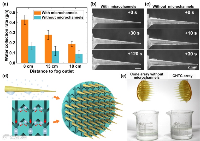 图5 微通道对水收集效率的影响。(a)单锥集水速率对比;(b-c)在雾气稳定收集阶段, 带/不带微通道的锥体表面水层状态;(d)纵横织构锥体阵列水收集装置示意图;(e)锥阵列水收集。