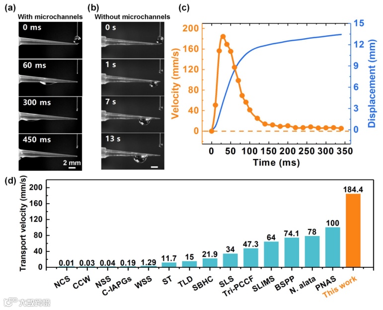 图2 纵横织构锥体表面液滴自运输。(a-b)带/不带微通道的锥体表面上液滴自运输行为;(c)纵横织构锥体表面液滴速度和位移随时间的变化;(d)纵横织构锥体和其他润湿梯度表面、非对称几何形状表面上液滴运输速度的对比。
