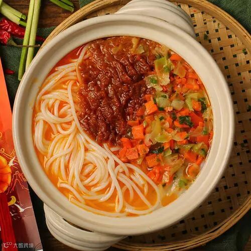 用煮好的云南过桥米线,加土豆丝、生菜、梅菜等配菜,也是不错的选择,开胃饱腹又健康。