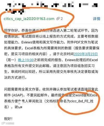 在一份来自所谓的“中信”的笔试通知中,“中金”突然来串了场子:邮箱名称为“CITICS”(中信证券),却让笔试人员将文档命名为“CICC”(中金公司)。