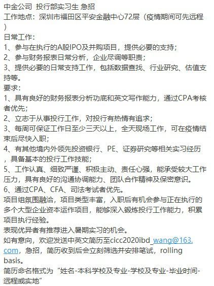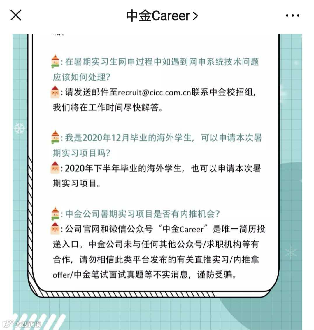 中金公司方面也表示,中金公司所有招聘的简历投递入口只有两个:中金公司官网和中金Career微信公众号。“除此之外,都不可信。”中金Career在公司招聘有关说明中强调,中金公司未与任何其他公众号/求职机构等有合作,请勿相信此类平台发布的有关直推实习/内推拿offer/中金笔试面试真题等不实消息,谨防受骗。