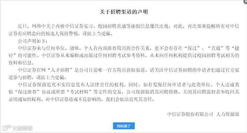 对此,中证君致电中信证券,对方回应:“假的,不是中信的。招聘公告一般会留公司邮箱。”