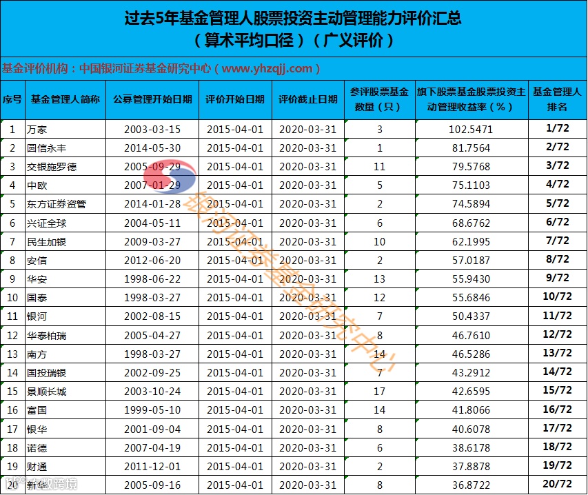 此外,中国银河证券基金研究中心还对公募基金管理人股票投资管理能力进行了评价。数据显示,过去五年间,万家基金、国信永丰基金、交银施罗德基金位居基金管理人股票投资主动管理能力前三。中欧基金、东方证券资管、兴证全球基金、民生加银基金、安信基金、华安基金和国泰基金等也表现不错。
