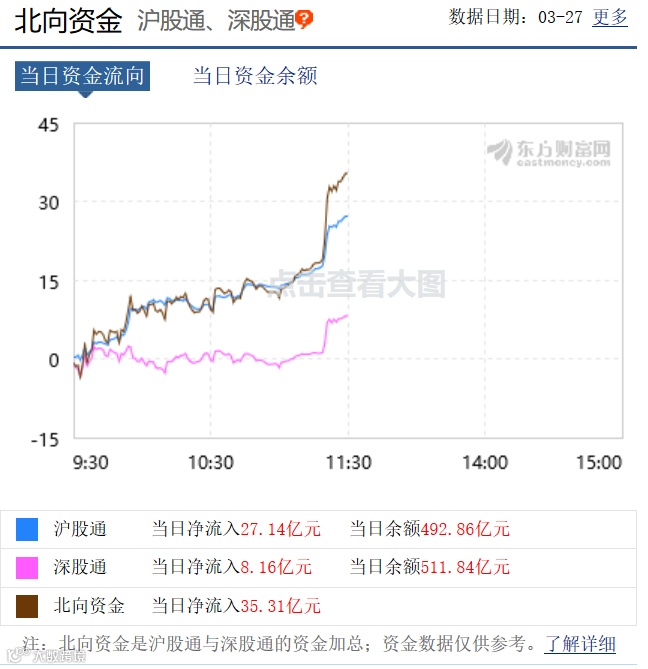 资金流向上,北向资金加速流入A股。东方财富网数据显示,截至午间收盘,北向资金半日净流入35.31亿元,其中沪股通资金净流入27.14亿元,深股通资金净流入8.16亿元。