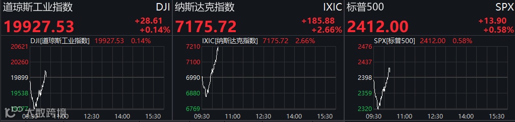 截至发稿时,纳指涨近3%,道指收复两万点关口,涨0.3%,标普500涨0.5%。