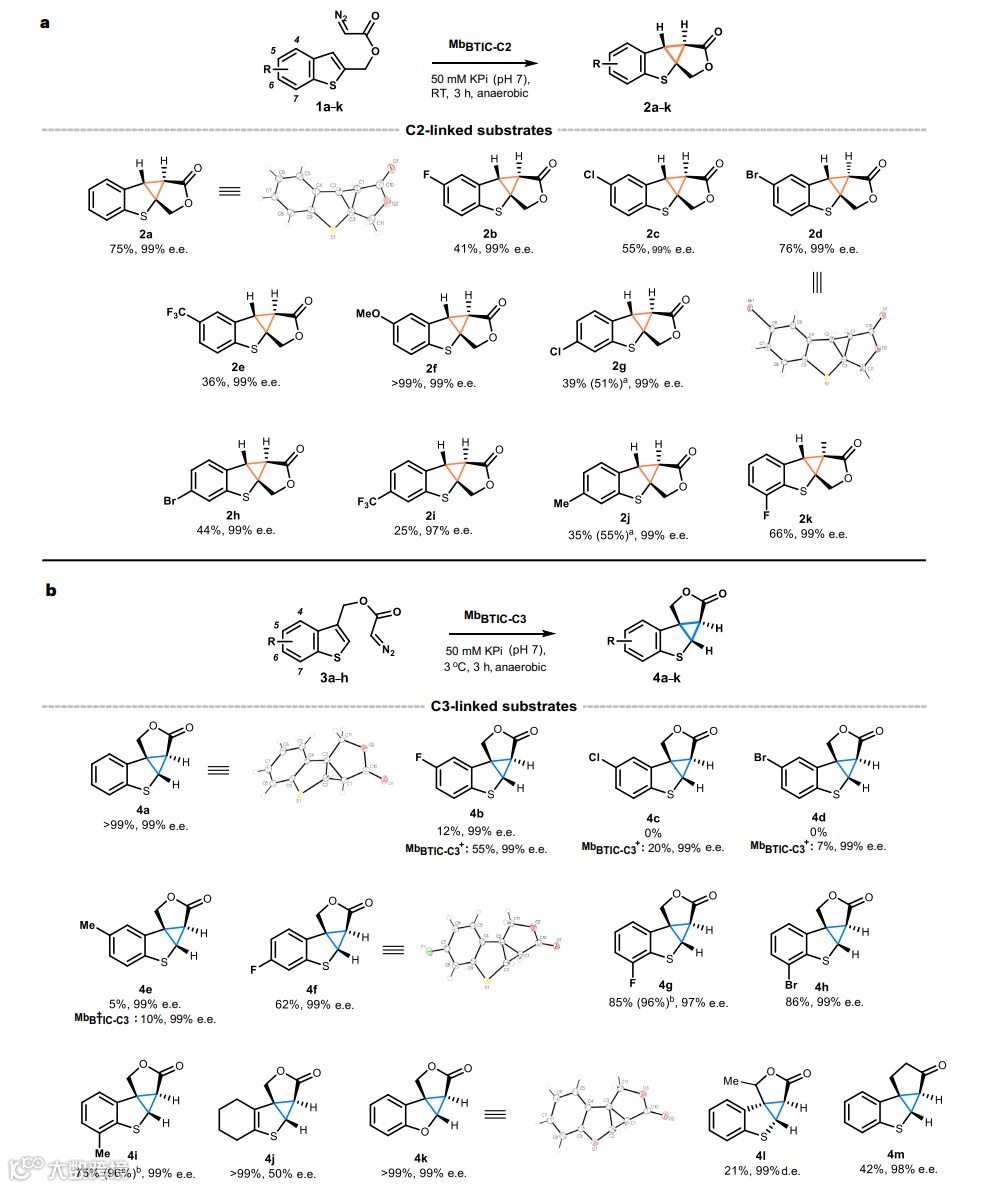 图2: 苯并噻吩底物的生物催化分子内环丙烷化。