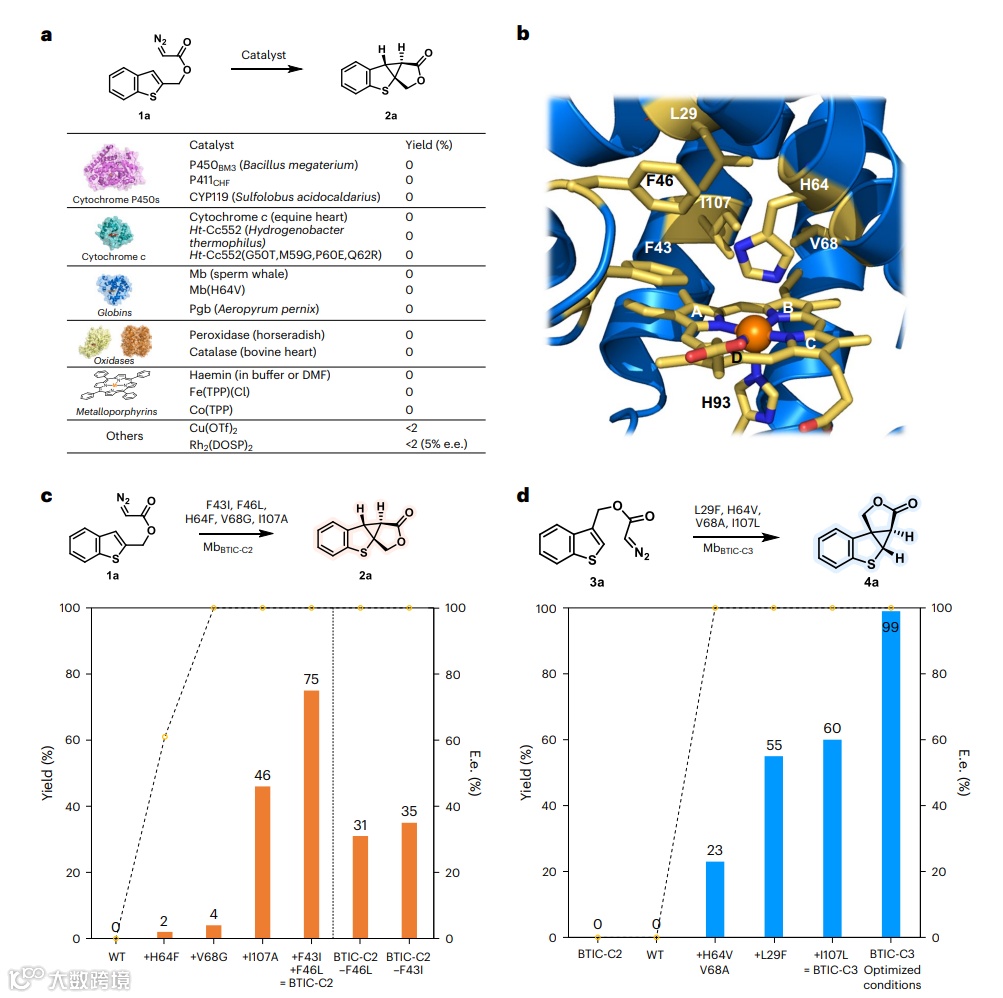 还开发了两种具有互补区域异构体选择性的卡宾转移酶,以催化在杂环C2或C3位带有重氮酯基团苯并噻吩底物的立体选择性环化。通过晶体学和计算分析的结合,阐明了这些反应的详细机理。