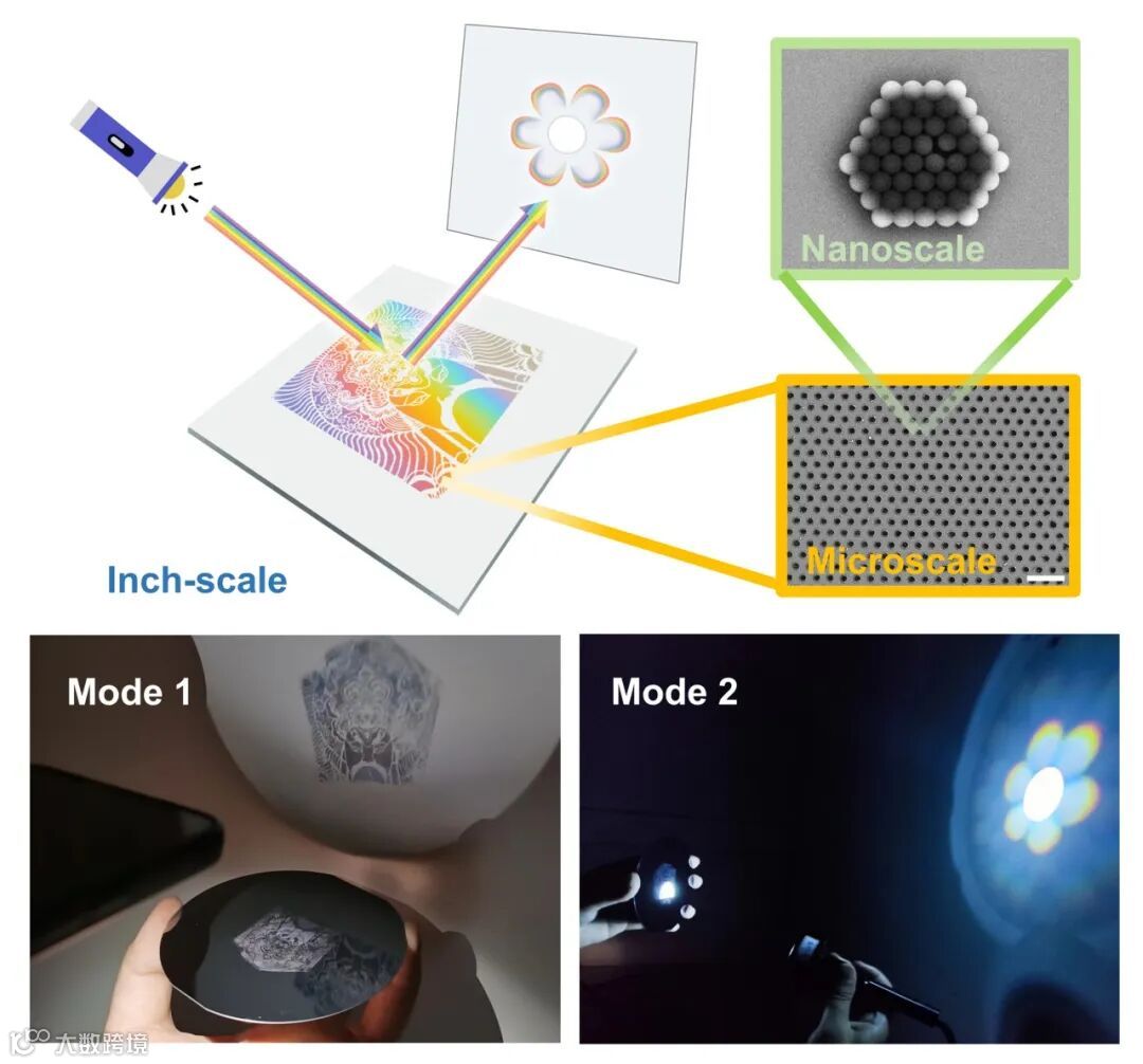 多尺度纳米结构图案化工艺的发展可促进新物理的发现和新型功能器件的实现。胶体纳米材料转印技术,将“自上而下”和“自下而上”工艺方法相结合,是多尺度纳米结构图案化研究的新方向。然而,由于衬底与结构之间的黏附能力较弱,非平面纳米结构难以直接转印。针对这一问题,团队提出了一种热辅助的非平面纳米结构图案化转印策略。通过调节温度来控制聚苯乙烯纳米球的杨氏模量,增加颗粒与衬底之间的接触面积及黏附力,从而实现了高效的直接转印。当转印温度接近聚苯乙烯的玻璃化转变温度时,转印效率从常温的3.1%显著提升至97.2%,并且所得纳米结构从无序状态变为长程有序状态。结合凹模版转印技术,在4英寸的硅片上实现了多尺度图案加工。在常用的激光笔、手机光照和宏观准直白光激励下,多尺度纳米结构图案可产生不同的光学图案,是一种新概念的光学防伪应用。