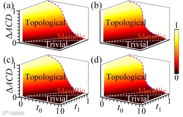 图2 平均电荷密度之差随t0及t1的变化(t0及t1分别为基本单元内及相邻基本单元间的最近邻耦合强度)。(a)与(b) Stampfli型准晶;(c)与(d) Stampfli环型准晶。