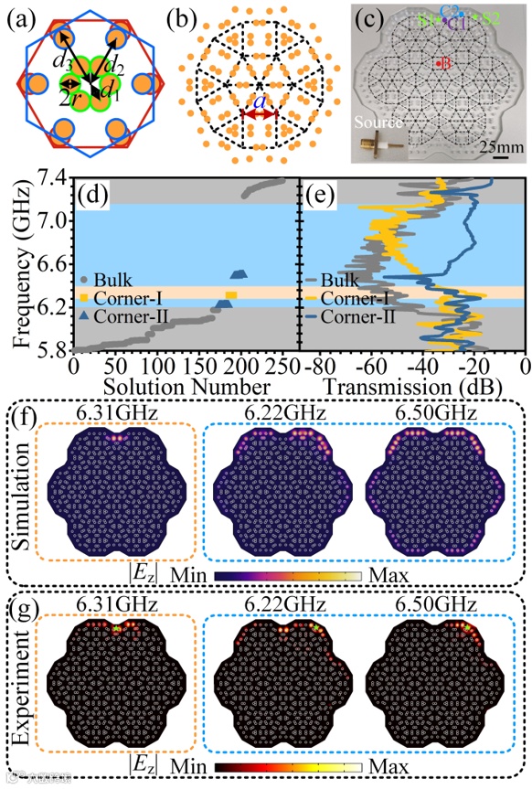 图3 Stampfli型光子高阶拓扑准晶绝缘体。(a) 基本单元示意(准晶中的单个格点,布置了6个点位,各点位布置散射体,散射体存在的3种间距情况);(b) 19个基本单元示意;(c) 实验样品照片;(d) 本征频率分布仿真结果;(e) 透射谱实验结果;角I及角II区域的拓扑角态:(f) 仿真结果;(g) 实验结果。
