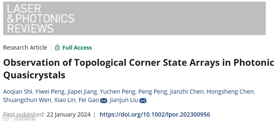A. Shi, Y. Peng, J. Jiang, Y. Peng, P. Peng, J. Chen, H. Chen, S. Wen, X. Lin, F. Gao, and J. Liu, “Observation of topological corner state arrays in photonic quasicrystals,”Laser & Photonics Reviews 2024, 2300956.