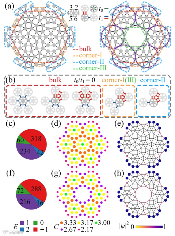 图1 基于多聚体分析法的Stampfli型及Stampfli环型准晶的紧束缚模型及高阶拓扑性。(a) 两种准晶结构的紧束缚模型;(b) 两种准晶中的多聚体类型;本征值能谱、电荷密度分布及波函数的归一化概率分布:(c)–(e) Stampfli型准晶;(f)–(h) Stampfli环型准晶。