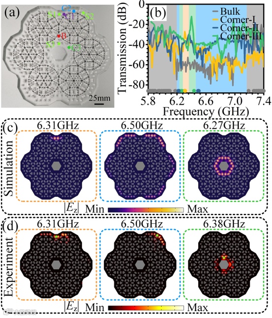 图4 Stampfli环型光子高阶拓扑准晶绝缘体。(a) 实验样品照片;(b) 本征频率分布仿真结果及透射谱实验结果;角I、角II及角III区域的拓扑角态:(c) 仿真结果;(d) 实验结果。