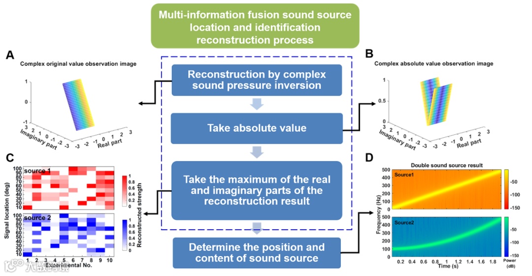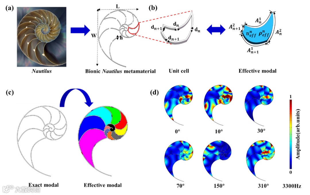 西安交通大学机械工程学院马富银教授课题组和中国科学技术大学姜添曦副研究员课题组提出一种鹦鹉螺仿生超结构装置,并通过多元信息融合压缩感知声成像方法,实现了利用单个传感器定位和识别多个宽带声源的功能。鹦鹉螺仿生超结构降低了结构复杂度,减少了结构复杂性带来的声损耗。为了克服规则结构各方向自相关系数高导致定位精度低的问题,提出了一种多元信息融合方法,实现了压缩感知声成像增强,提高了方向定位能力。这种仿生超结构定位装置具有辨识成功率高和抗干扰能力强等特点,方法对结构各向异性要求大幅降低,具有广泛的工程应用前景。