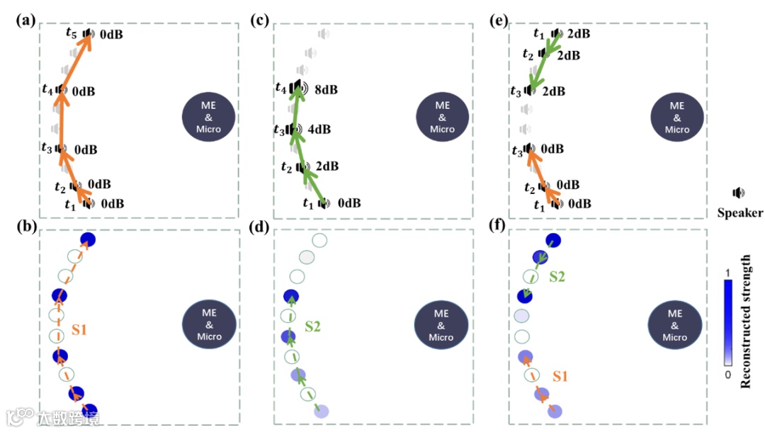 研究人员进一步测试了单传感器多元信息融合声源监听系统的声学追踪与成像性能,如图7所示。从图中可以看出,所提出系统实现了对多个目标的跟踪,对目标进行了准确识别,并基本可通过重建强度反映声源强度大小。实验结果证明,单传感器声源监听系统可以同时识别多个声源位置信息、内容信息、强度信息,并可以快速地准确地跟踪多个声源。