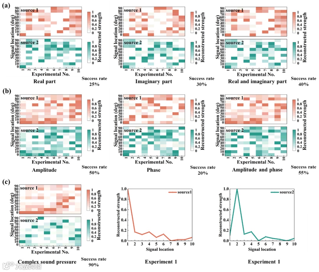 论文进一步提出了一种鹦鹉螺仿生多元信息融合压缩感知声成像装置原型,展示了方位多声源的识别效果。单声源定位结果如图4所示。从图中可以看出,分别利用声源信号的实部信息和虚部信息均可实现单声源的定位,声源估计位置与实际位置一致,而采用实虚部联合成像则可以使得单声源定位的准确度更好,可分辨性更高。单声源定位结果验证了基于超结构的单探测器压缩感知声源监听系统能够识别宽带单声源的方位。双声源辨识结果如图5所示。利用辨识成功率来评价重建结果。从图中可以看出,利用实部信息进行双声源辨识的成功率为25%,利用虚部信息进行双声源辨识成功率为30%,利用实虚部联合优化重建方法的辨识成功率比单独利用实部、虚部信息成功率高,为40%。利用幅值信息进行双声源辨识的成功率为50%,利用相位信息进行双声源辨识成功率为20%,利用幅值相位联合优化重建方法的辨识成功率比单独利用幅值、相位信息成功率高,为55%。利用复声压进行双声源辨识的成功率高达90%,远超利用单一信息要素进行辨识的正确率,证明复声压多元融合技术具有高分辨率、高准确率特点,具有广阔的应用前景。