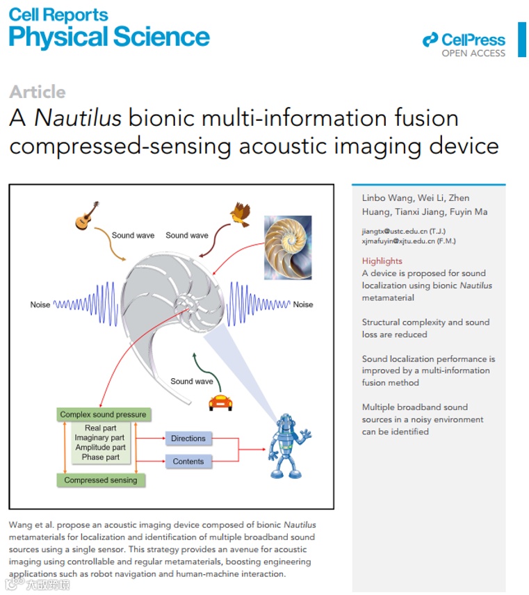 相关研究成果以“一种鹦鹉螺仿生多元信息融合压缩感知声成像装置”(A Nautilus bionic multi-information fusion compressed-sensing acoustic imaging device)为题,在线发表在《Cell Reports Physical Science》[Cell Reports Physical Science, 4, 101733, 2023]上,并收到封面候选邀请。西安交通大学为第一作者单位,西安交通大学和中国科学技术大学为通讯单位,机械工程学院硕士生王林波为第一作者,马富银教授和姜添曦副研究员为共同通讯作者。