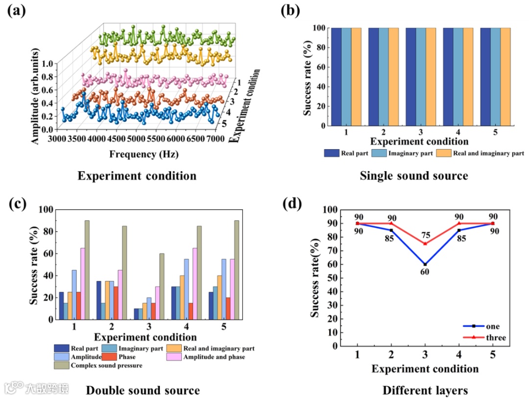 论文考虑到所设计的单传感器监听系统在实际使用时面临环境的复杂性,测试了不同实验环境和实验条件下的方位声源辨识结果,如图6所示。实验结果表明,不同实验环境下,利用复声压进行单声源和双声源辨识的辨识成功率都是最高的,再次证明了复声压辨识的优势。同时,可以发现即使是噪声干扰环境下,复声压辨识成功率仍有85%,证明了复声压多元融合方法对噪声干扰具有鲁棒性,抗干扰性。此外,为了进一步提升单传感器声源监听系统的准确率,设计了三层鹦鹉螺仿生超结构,并对三层与单层鹦鹉螺结构双声源辨识结果进行了比较。实验结果表明,在各种不同的实验环境,无论是噪声干扰还是安静环境,基于三层鹦鹉螺仿生超结构的双声源辨识成功率均要高于单层鹦鹉螺超结构,这证明鹦鹉螺仿生超结构的可再设计性、可优化性,为未来更精细工作目标要求提供优化空间。