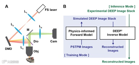 图1 DEEP2的成像方案。(A)DEEP-TFM显微镜的光路图。(B)利用激发模式和测量图像来重建去散射图像。