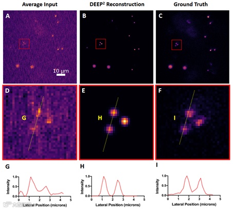 图5 在表面下4个SLS处的荧光微珠上进行的DEEP2重建图像测试结果。(A) 32个图案激发的DEEP-TFM显微镜观察穿过脂肪乳液层的直径为1 μm和4 μm的微珠混合物的实验图像。(B)对应于(A)的DEEP2重建结果。(C)对应于(A)的无脂肪乳液生成的基准图像。(D)、(E)和(F)为在(A)、(B)和(C)图像上红色方框标识区域的放大图。(G)、(H)、(I)为(D)、(E)和(F)图中黄色线条的归一化强度剖面图。
