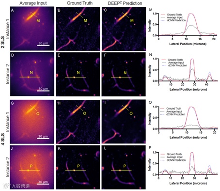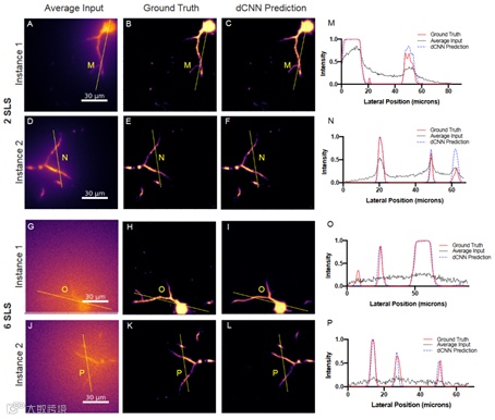 图3 处于2个和6个SLS深度的具有树突的小鼠锥体神经元的DEEP2验证结果。(A)、(D)、(G)、(J)用于验证的四个代表性模拟DEEP-TFM图像堆栈(在32个模式上取平均)。(B)、(E)、(H)、(K)对应于(A)、(D)、(G)和(J)的PSTPM基准图像。(C)、(F)、(I)、(L)对应于(A)、(D)、(G)和(J)实例的DEEP2重建结果(dCNN预测)。黄色线段M、N、O和P的强度在(M)、(N)、(O)和(P)图表中可视化。