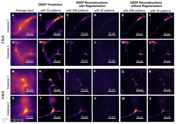 图6 利用DEEP2模型对实验采集的在表面下2和4个散射长度(SLS)的小鼠皮质血管的DEEP-TFM图像进行了图像重构结果。(A)、(G)、(M)和(S)为四个代表性的DEEP-TFM图像堆栈。(B)、(H)、(N)和(T)对应于(A)、(G)、(M)和(S)的DEEP2重建结果,使用32个模式的激发。(C)、(I)、(O)和(U)对应于(A)、(G)、(M)和(S)带有正则化的常规DEEP重建结果,使用256个模式的激发。(D)、(J)、(P)和(V)对应于(A)、(G)、(M)和(S)带有正则化的常规DEEP重建结果,使用32个模式的激发。(E)、(K)、(Q)和(W)对应于(A)、(G)、(M)和(S)不带有正则化的常规DEEP重建结果,使用256个模式的激发。(F)、(L)、(R)和(X)对应于(A)、(G)、(M)和(S)不带有正则化的常规DEEP重建结果,使用32个模式的激发。